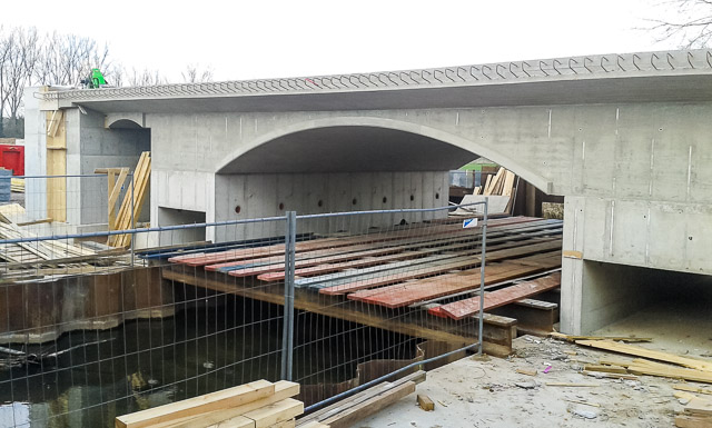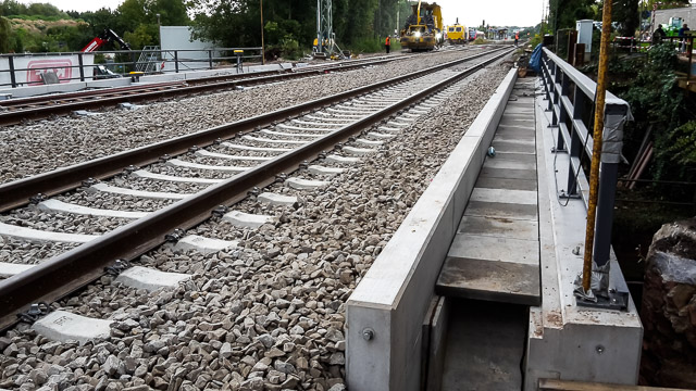 Die bestehende Gewölbebrücke wies massive Schäden auf und musste erneuert werden. Die Eisenbahnüberführung wurde durch einen Halbrahmen in Stahlbetonbauweise ersetzt. Der neue Rahmen überführt zwei Gleise der Strecke 3557. Der Überbau ist bogenförmig analog zum ehemaligen Bestand ausgeführt worden. In den Widerlagern sind parallel zum Bachlauf Fußgängerdurchgänge integriert. Das Rahmenbauwerk ist flach auf dem Bestand gegründet. Das Bauwerk ist seitlich in einer Herstelllage gebaut worden und während einer Sperrpause mittels Fluidverfahren in Endlage verschoben worden.