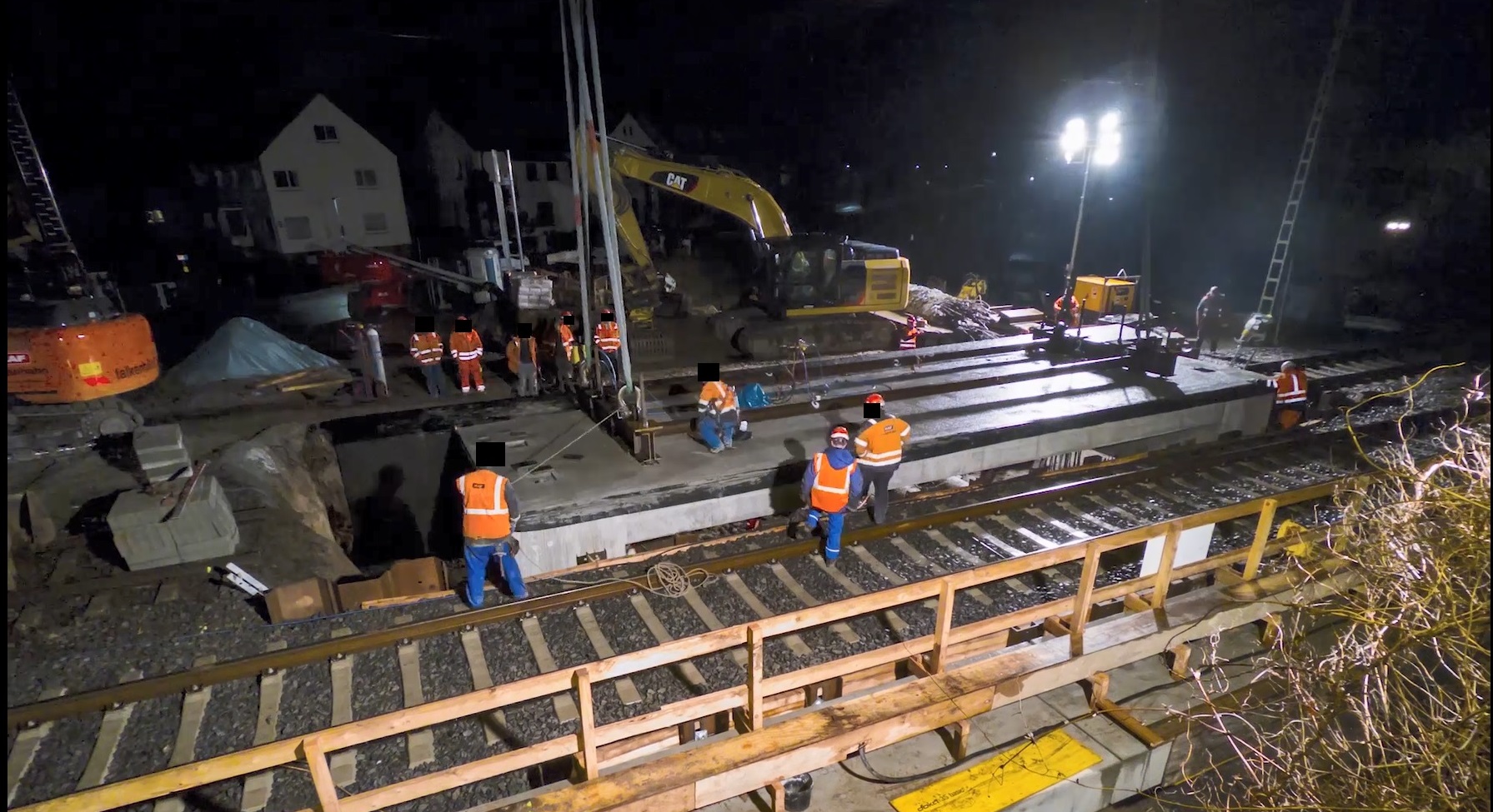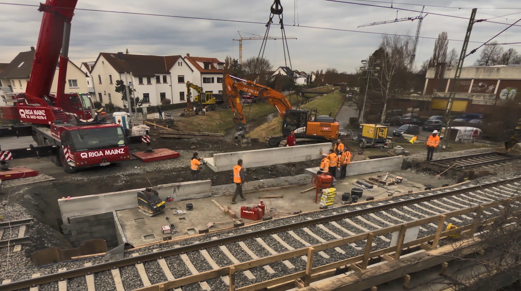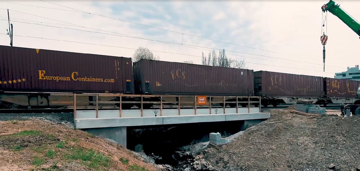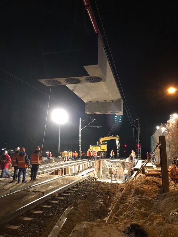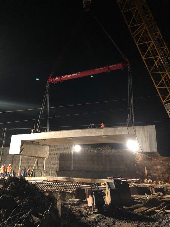 Die Erneuerung der Eisenbahnüberführung über den Winkelbach in Bensheim befindet sich auf der DB-Strecke Frankfurt (Main) Hbf - Heidelberg-W. Es werden zwei elektrifizierte Gleise überführt. Das alte Bauwerk bestand aus WIB-Konstruktionen, auf Grund des schlechten Zustandes musste es erneuert werden. Die neue Überführung besteht aus zwei mit einer Längsfuge getrennten Stahlbetonhalbrahmen, diese sind auf Bohrpfählen tiefgegründet. Zunächst sind in einer ersten Sperrpause die Bohrpfähle und die erforderlichen Verbauten eingebracht worden. Die Pfahlkopfbalken wurden zusammen mit den Überbaudecken außerhalb des Gleisbereichs vorgefertigt. In den Pfahlkopfbalken sind runde Aussparungen zur späteren Aufnahme der Bohrpfahlbewehrung vorgesehen worden. Während zwei weiterer Sperrpausen wurden die Rahmen mit einem Raupenkran eingehoben. Anschließend konnten die Aussparungen in den Pfahlkopfbalken nach dem jeweiligen Einhub vergossen und der Oberbau wiederhergestellt werden.