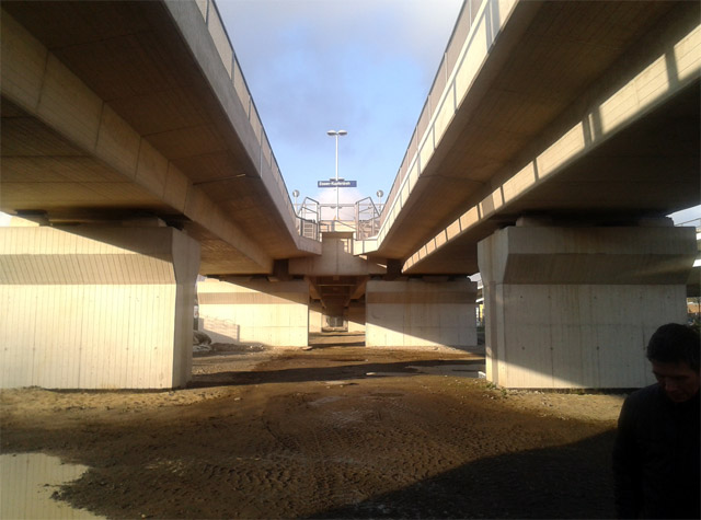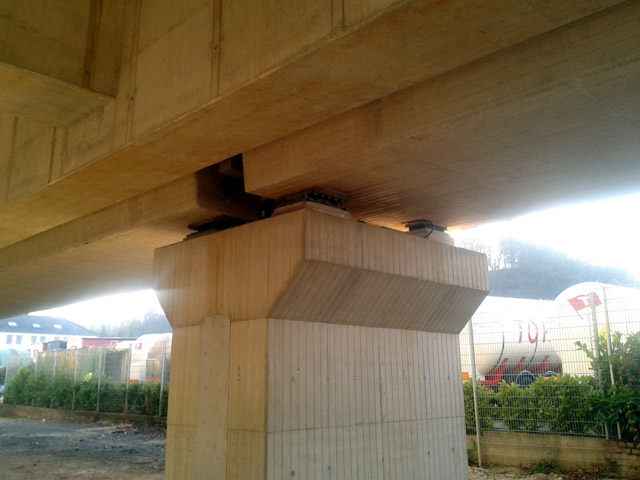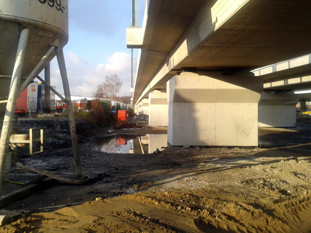 Im Zuge des Neubaus der Aufständerung für die S9 in Essen-Kupferdreh wurde für jedes Richtungsgleis eine ca. 270 m lange Spannbetonbrücke hergestellt. Hierbei handelt es sich um zwei eingleisige Einfeldträgerketten, bestehend aus jeweils 12 Überbauten. Die Überbauten liegen in unterschiedlich gekrümmten Gleisbögen und sind als Spannbetonträger mit Vollquerschnitt ausgeführt. Die Vorspannung erfolgt ausschließlich in Längsrichtung mittels Spanngliedern mit nachträglichem Verbund. Die Herstellung der Überbauten erfolgt auf einem Leergerüst in Endlage. Sie lagern für jedes Gleis getrennt voneinander auf Pfeilern und an den Enden der Einfeldträgerketten zusammen auf jeweils einem Widerlager auf. Zudem sind auf einigen Pfeilern neben den Gleisüberbauten auch die Bahnsteigbrücken aufgelagert. Die Unterbauten wurden auf Bohrpfählen mit D=1,20 m tiefgegründet.