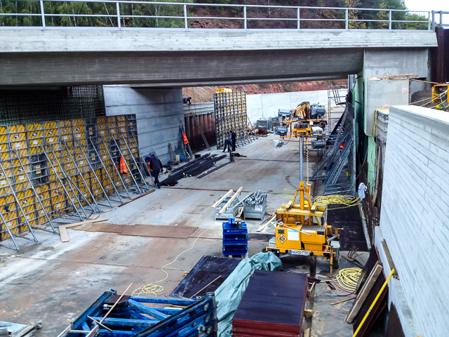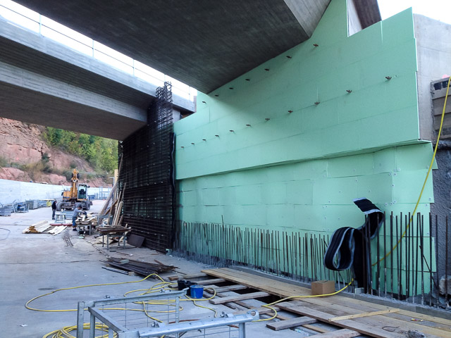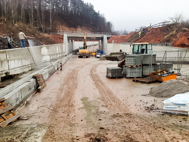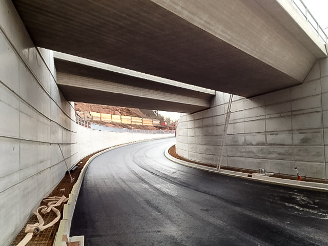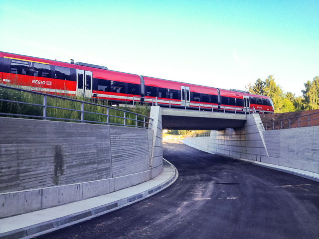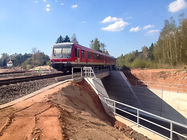 Im Zuge des Neubaus der Bundesstraße B 48 ist zur Überführung der beiden Gleise der DB Strecke 3320 eine Eisenbahnbrücke und wegen des hochanstehenden Grundwassers ein ca. 164 m langes Trogbauwerk gebaut worden. Die EÜ ist als Rahmenbauwerk in Deckelbauweise gebaut worden. Dabei werden beide Gleise auf getrennten Überbauten überführt. Diese sind auf einem durchgehenden Pfahlkopfbalken und einer überschnittenen Bohrpfahlwand Ø 1,20 m tiefgegründet. Die EÜ besitzt eine Stützweite von Ls=19,60 m. Das Trogbauwerk besteht aus 18 Bauwerksblöcken, wobei die östlichen Blöcke 1-8 in einer offenen Baugrube und die Blöcke 9-18 in einer wasserdichten Baugrube bestehend aus einer überschnittenen Bohrpfahlwand hergestellt werden konnten. Die überschnittene Bohrpfahlwand beteiligt sich im Endzustand am Lastabtrag und das Eigengewicht der Bohrpfähle wird zur Auftriebssicherung herangezogen.