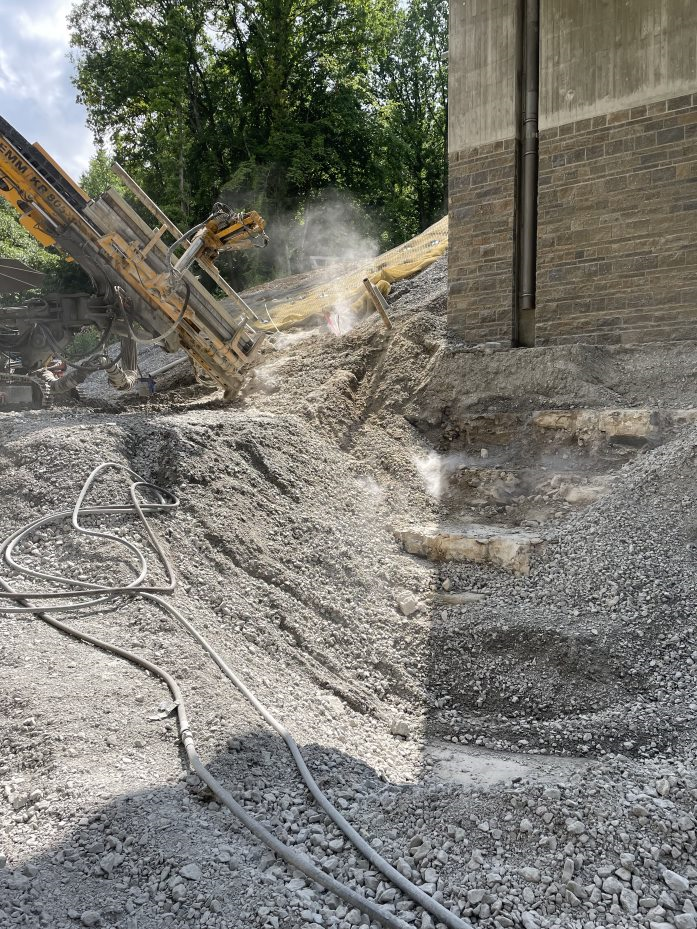 Die Baumaßnahme umfasste die Erneuerung der EÜ Burgstetten auf der DB-Strecke von Backnang nach Ludwigsburg. Die Bestandsbrücke war eine eingleisige Stahlfachwerkbrücke. Gebaut wurden neue Unterbauten hinter den bereits bestehenden Unterbauten und ein neuer eingleisiger Überbau als Stahlfachwerkkonstruktion. Die 35m lange Fachwerkbrücke aus Stahl ist auf Stahlbetonwiderlagern aufgelagert worden. Das östliche Widerlager ist Flach als Kastenwiderlager im Fels gegründet worden. Das westliche Widerlager besteht aus einem Pfahlkopfbalken der auf Bohrpfählen tiefgegründet ist. Zur Gewährleistung der hohen Anforderungen an die Gebrauchstauglichkeit sind die Widerlager mit GEWI-Pfählen rückverankert worden. Zudem ist auf der Westseite die Böschung zusätzlich mit einer Böschungsvernagelung gesichert worden.