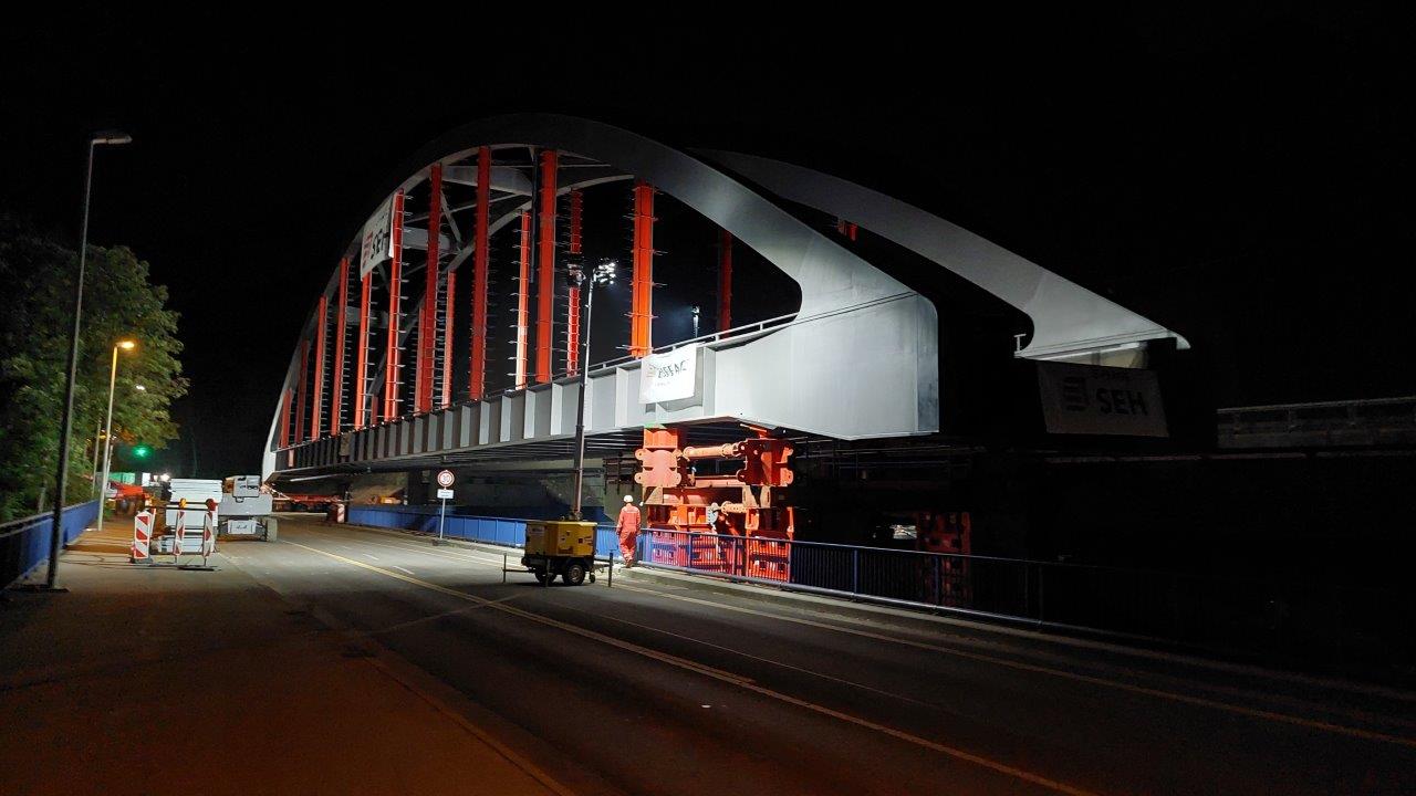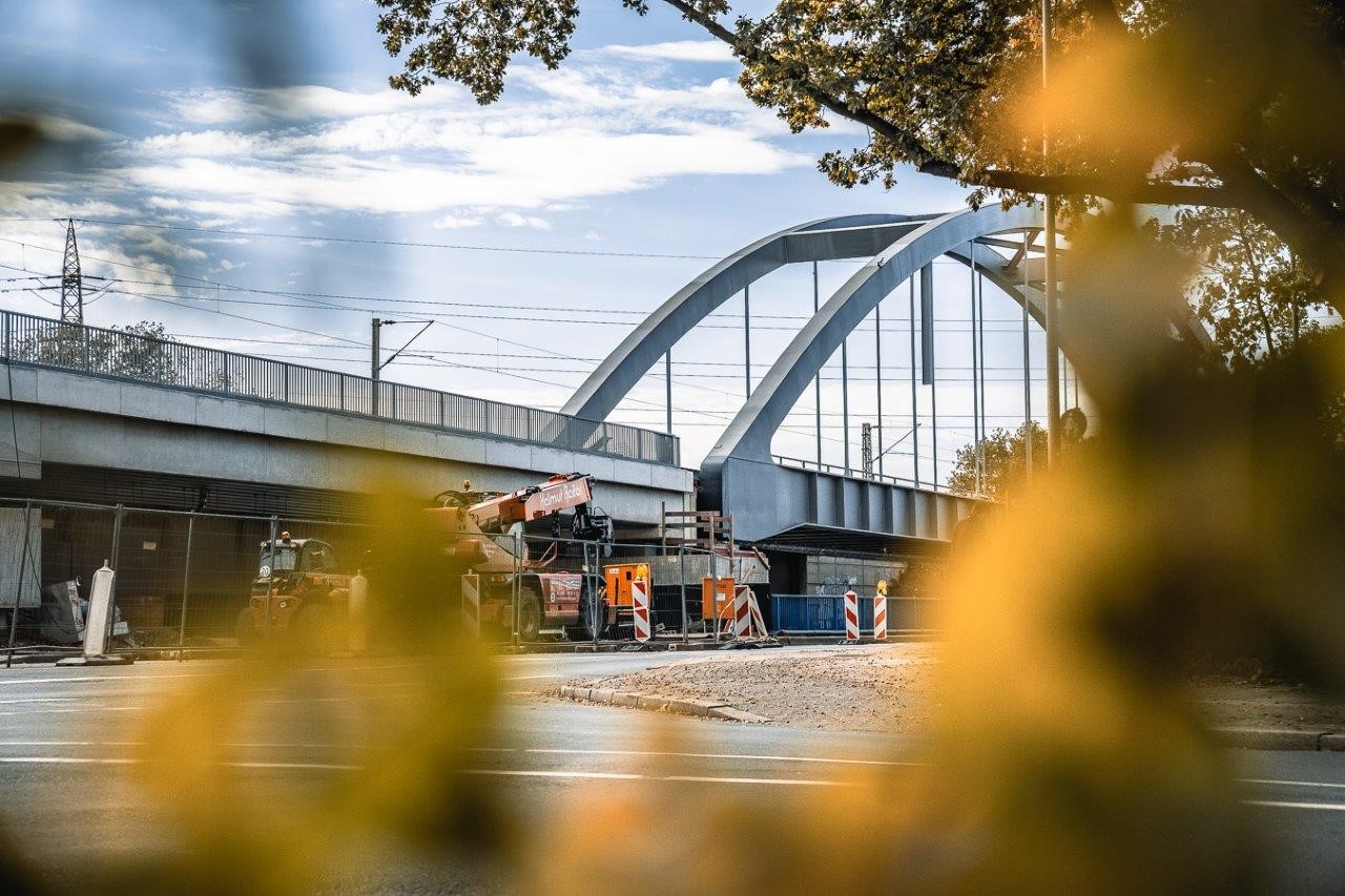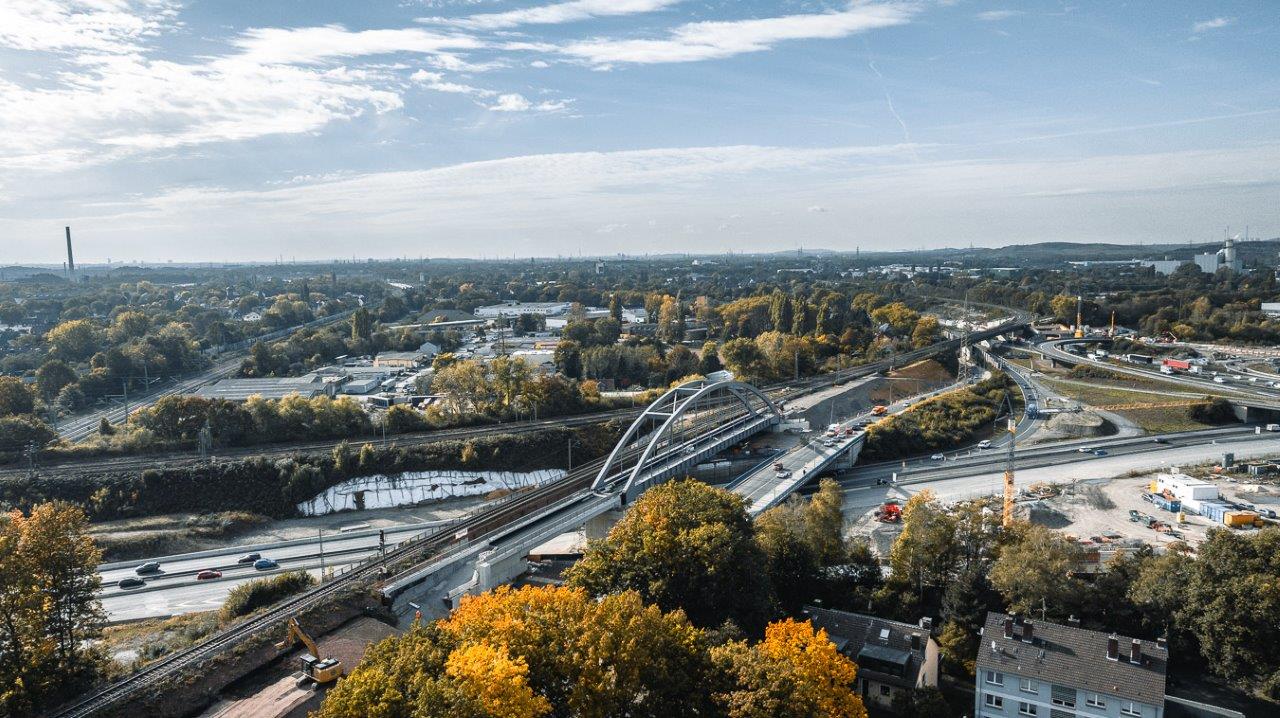 Bei dem Bauvorhaben handelt es sich um den Neubau eines Kreuzungsbauwerks für die DB Netz AG und die Autobahn GmbH des Bundes am Autobahnkreuz A42/A43 in Herne. Das Brückenbauwerk überführt ein Gleis auf einem 2-feldrigen Brückenzug mit Stützweiten von L1= 97,5m und L2 = 32,4m über die BAB 43. Die größere Stützweite wird dabei von einer Stabbogenbrücke aus Stahl überspannt. Sie wurde aus der seitlichen Herstelllage verschoben und in Endlage verfahren. Die Spannweite von 32,4m wird durch einen WIB-Überbau überbrückt. Beide Überbauten wurden auf Elastomerlagern aufgelagert und besitzen ein allseits festes Lager am Mittelpfeiler. Die Gründung der Widerlager und des Mittelpfeilers erfolgt mittels Tiefgründung auf Bohrpfählen. Die Widerlager, der Pfeiler und der WIB-Überbau wurden in Endlage gebaut.