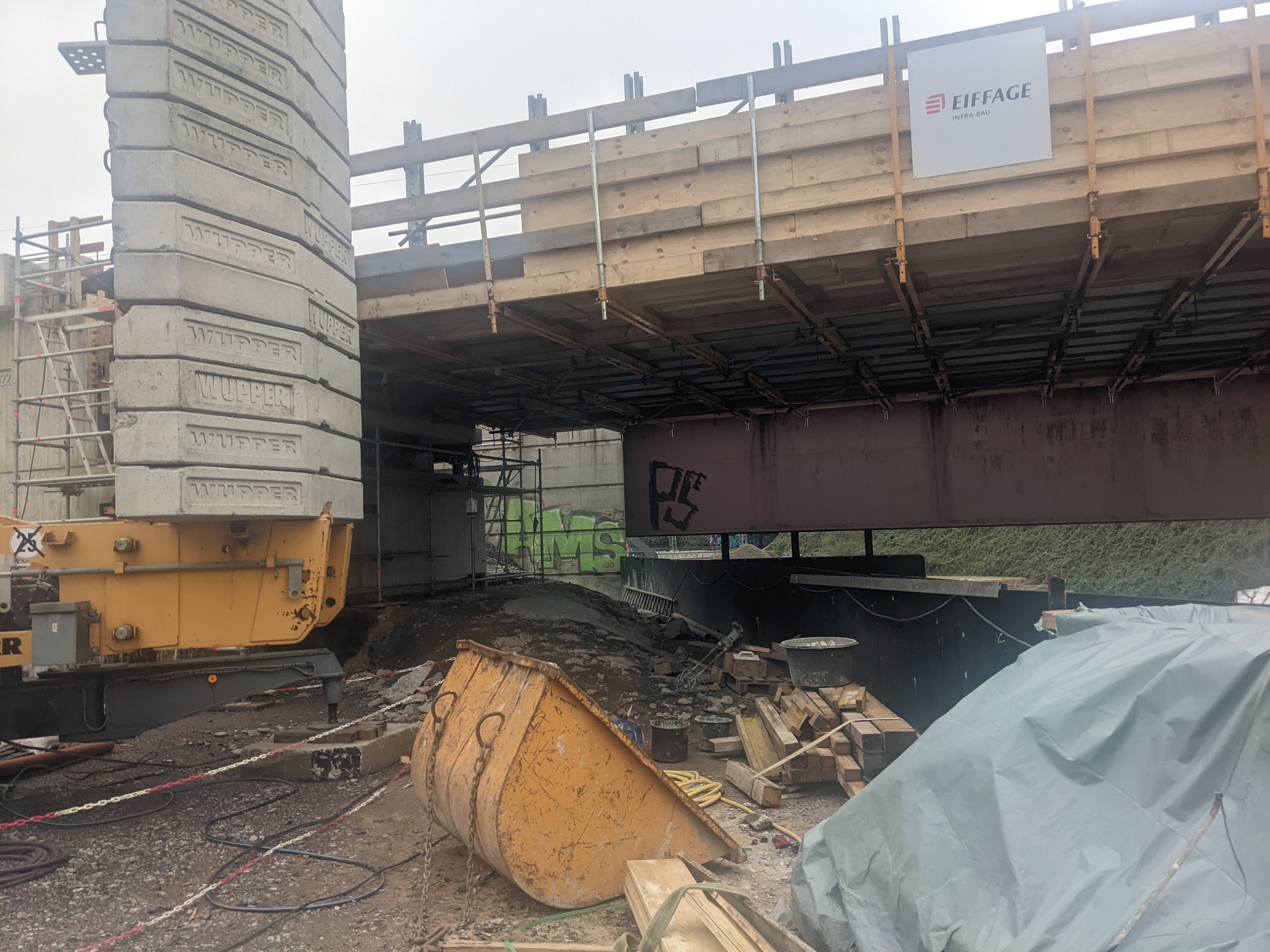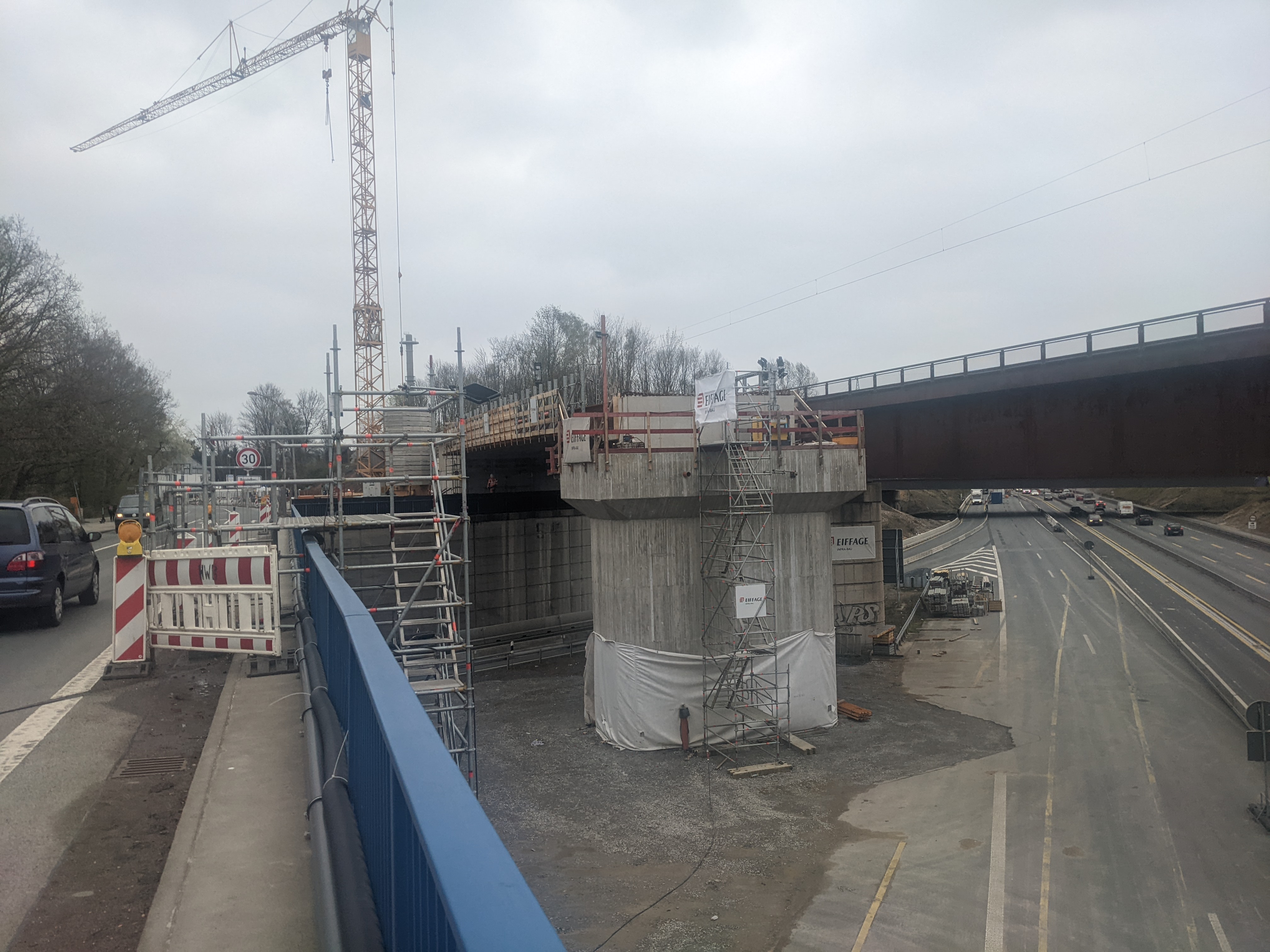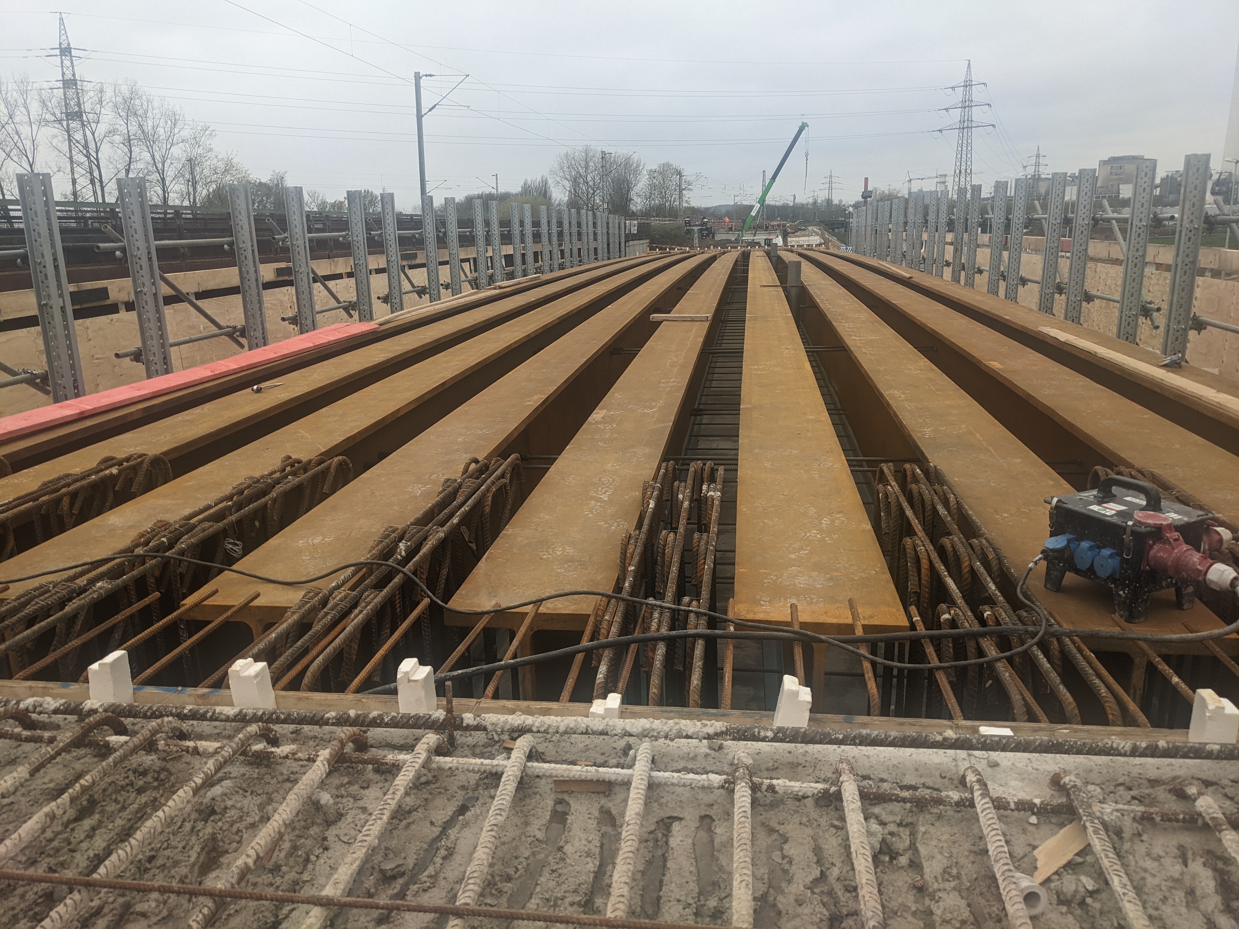 Bei dem Bauvorhaben handelt es sich um den Neubau eines Kreuzungsbauwerks für die DB Netz AG und die Autobahn GmbH des Bundes am Autobahnkreuz A42/A43 in Herne. Das Brückenbauwerk überführt ein Gleis auf einem 2-feldrigen Brückenzug mit Stützweiten von L1= 97,5m und L2 = 32,4m über die BAB 43. Die größere Stützweite wird dabei von einer Stabbogenbrücke aus Stahl überspannt. Sie wurde aus der seitlichen Herstelllage verschoben und in Endlage verfahren. Die Spannweite von 32,4m wird durch einen WIB-Überbau überbrückt. Beide Überbauten wurden auf Elastomerlagern aufgelagert und besitzen ein allseits festes Lager am Mittelpfeiler. Die Gründung der Widerlager und des Mittelpfeilers erfolgt mittels Tiefgründung auf Bohrpfählen. Die Widerlager, der Pfeiler und der WIB-Überbau wurden in Endlage gebaut.
